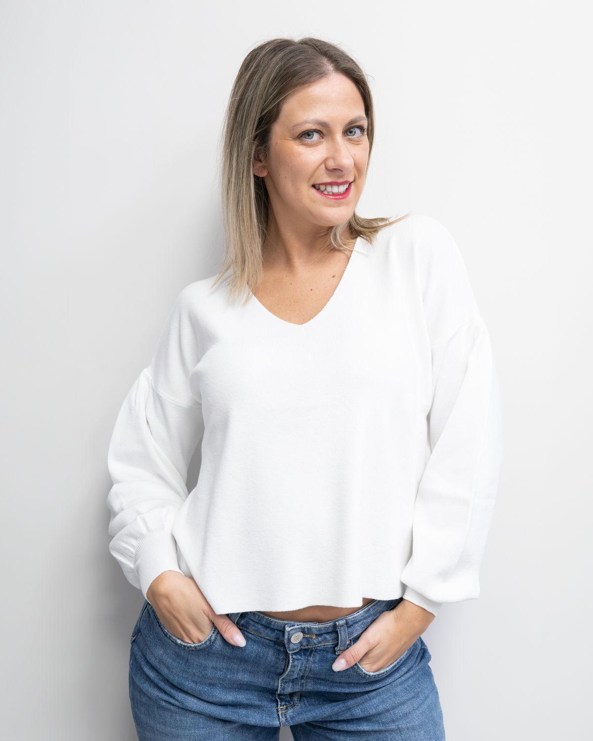 Maglia Kontatto con scollo a V davanti e dietro, manica a palloncino e spacchetto decorativo dietro. Il capo presenta una linea quadrata a scatoletta.